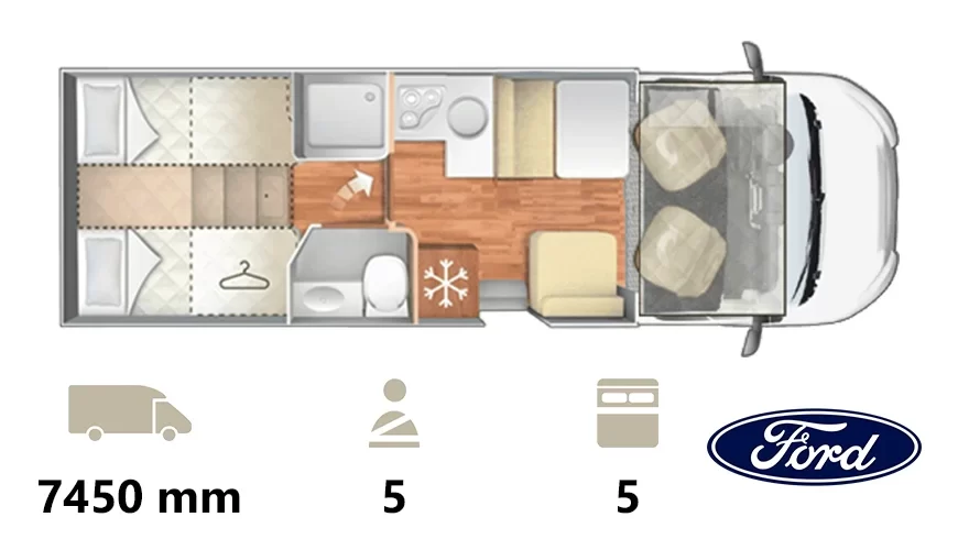 - Lungimea sa de 7,45 m oferă suficient spațiu pentru a găzdui până la 5 persoane.